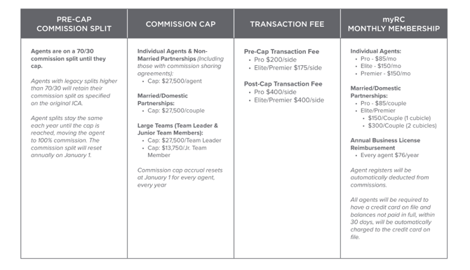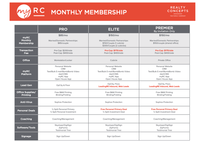 Realty Concepts offers three membership options for agents, ranging from $85-150 per month. All RC agents will keep a credit card on file for your membership dues. Use this link to change your myRC Membership at any time.
